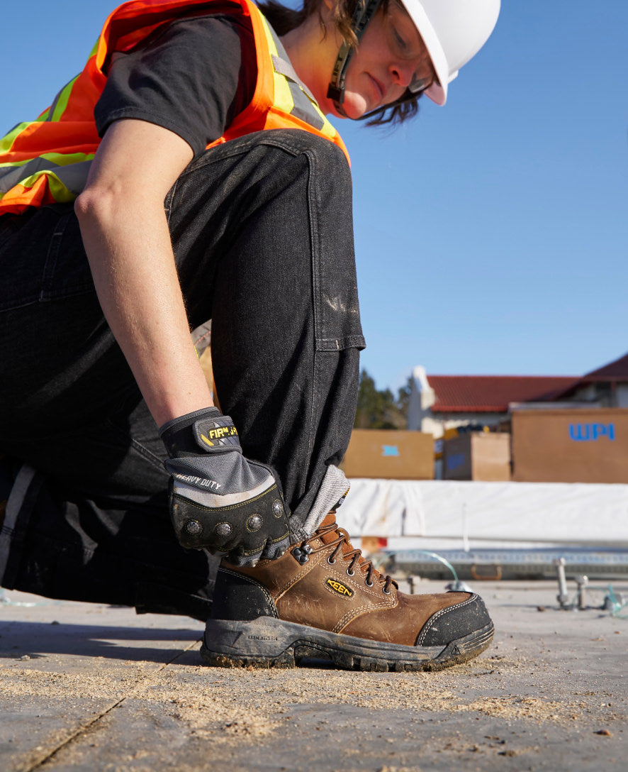 Protects like a work boot, feels like a sneaker. This women’s waterproof 6″ style features a leather upper, energy-returning cushioning, and internal met protection.